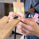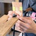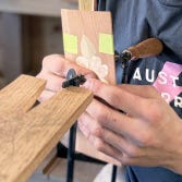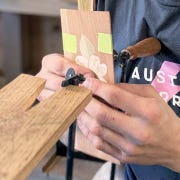 When Kelly cuts the slots for her splines, she does it a little differently. Instead of using a router table or table saw, she simply plunges the cutter of a biscuit joiner right into the edge of the joint.